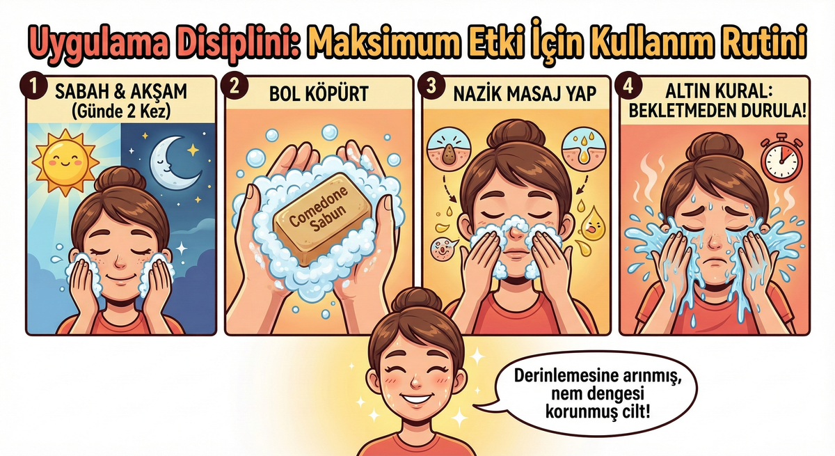 Doğru içerik, doğru uygulama ile birleştiğinde mucizeler yaratır. Comedone Sabun’dan en yüksek verimi almak için profesyonel rutinimiz şöyledir: