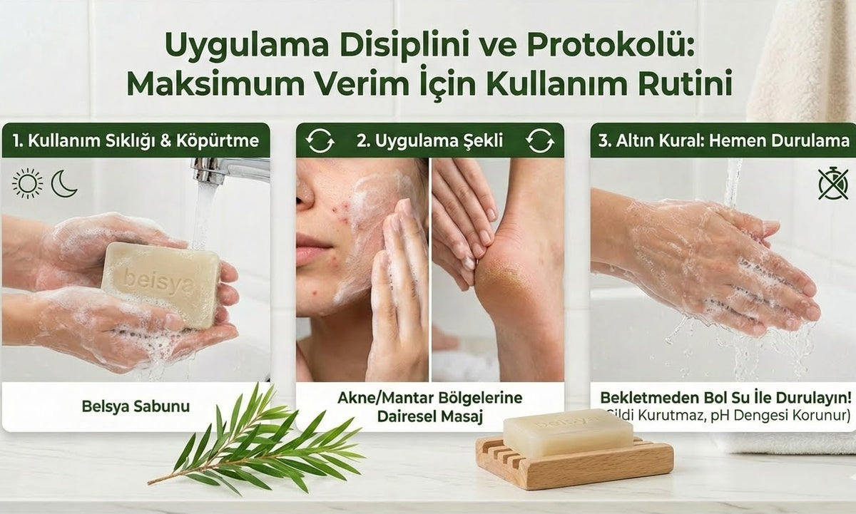 Aktif içerikli bitkisel sabunlarda doğru uygulama, beklenen sonucun anahtarıdır. Çay Ağacı Sabunu’ndan en iyi verimi almak için şu rutini takip edin: