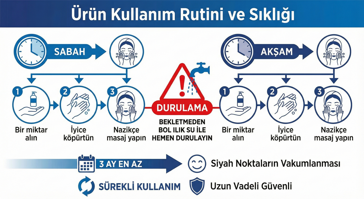 - İstikrar ve Süre: Cildin kendini yenileme döngüsünü tamamlaması ve siyah noktaların tamamen vakumlanması için en az 3 ay boyunca düzenli kullanım önerilir. Genel yüz hijyenini korumak adına uzun vadeli, sürekli kullanım için de son derece güvenlidir.