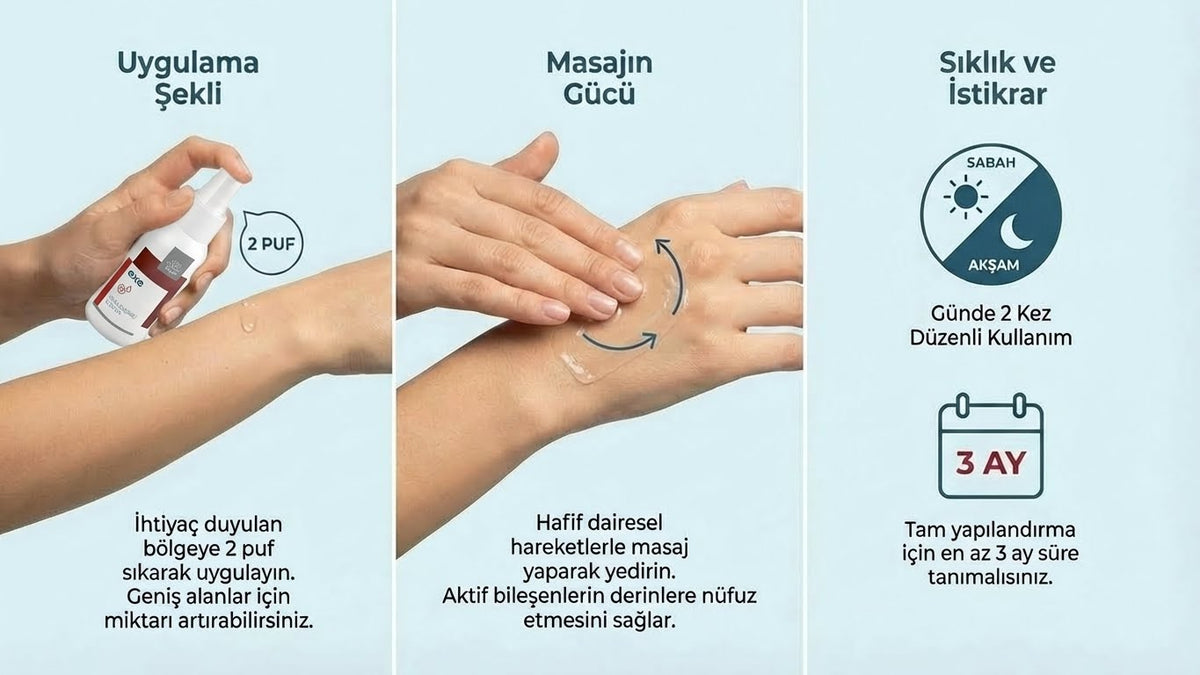 - Uygulama Şekli: Pompalı valf yardımıyla ihtiyaç duyulan bölgeye 2 puf sıkarak uygulayın. Eğer uygulama yapılacak alan genişse, miktarı artırabilirsiniz.